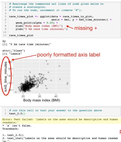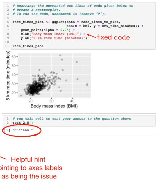 많은 양의 실습을 제공할 때는 즉각적인 피드백이 반드시 병행되어야 합니다. 피드백 없는 연습은 가치가 한정적입니다. 하지만 제한된 교육 자원으로 어떻게 많은 양의 피드백을 실시간으로 줄 수 있을까요? 한 가지 방법은 소프트웨어를 활용한 자동화된 테스트를 이용하는 것입니다. 데이터 과학 과제의 상당 부분은 코드를 작성하는 것이므로, 학생들의 답이 특정 부분에서 틀렸을 때 이를 알려주거나 올바른 방향으로 유도하는 힌트를 제공하는 테스트 코드를 작성할 수 있습니다. 그림 2는 그 실제 사례를 보여줍니다. 여기에서 학생들은 파슨스 프로블럼(Parsons problem, 섞여 있는 코드 한 줄씩을 올바른 순서로 재배열하는 문제) 형식의 ggplot 코드를 받았습니다. 이 예시에서 학생은 코드를 나열했지만 구문 오류(Syntax error)를 범했고, 예상과 다른 결과가 나왔습니다. 즉각적인 피드백이 없다면 학생은 과제가 채점되고 결과가 돌아올 때(보통 며칠 또는 몇 주 뒤)까지 문제가 있다는 사실조차 깨닫지 못할 수도 있습니다. 자동화된 소프트웨어 테스트는 학생들의 집중력이 해당 주제에 머물러 있을 때 즉각적인 피드백을 제공합니다. 이 교수법은 컴퓨터 과학 분야에서 처음 개발되었으며24, 현재 데이터 과학 교육에도 도입되고 있습니다. R을 위한 learnr 패키지25, 그리고 R과 Python 모두에서 작동하는 NBgrader26나 Otter Grader27와 같은 훌륭한 소프트웨어들이 있습니다.