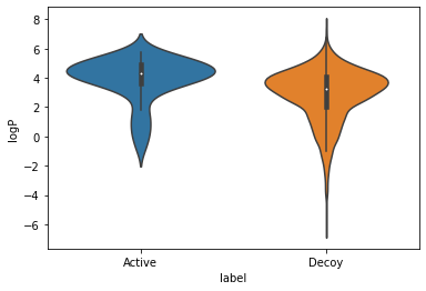 바이올린 플롯을 통해 LogP 분포 간 비슷한 비교도 가능합니다. 여기서도 유인(decoy) 그룹 하위권 범위에 화합물이 약간 더 포함되어 있으나 두 분포의 전반적 양상은 크게 다르지 않음을 확인할 수 있습니다.
