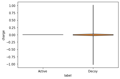 위 그림에서 두 세트의 분자량 분포가 대체로 동일하다는 것을 알 수 있습니다. 유인(decoy) 세트 쪽에 낮은 분자량 화합물이 더 많기는 하지만, 각 바이올린 플롯 중간에 표시된 상자로 볼 수 있는 분포의 중심값은 두 그래프 모두 비슷한 위치에 놓여 있습니다.