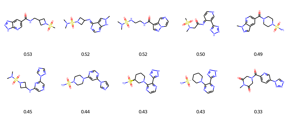 위 화면의 결과를 확인하면 최상위 등급을 기록한 화합물 무리들의 구조가 상당 부분에서 동일한 패턴을 표출함을 확인할 수 있습니다. 시선을 돌려 상위권 이하 몇몇 분자 역시 마저 탐색해 보도록 합시다.