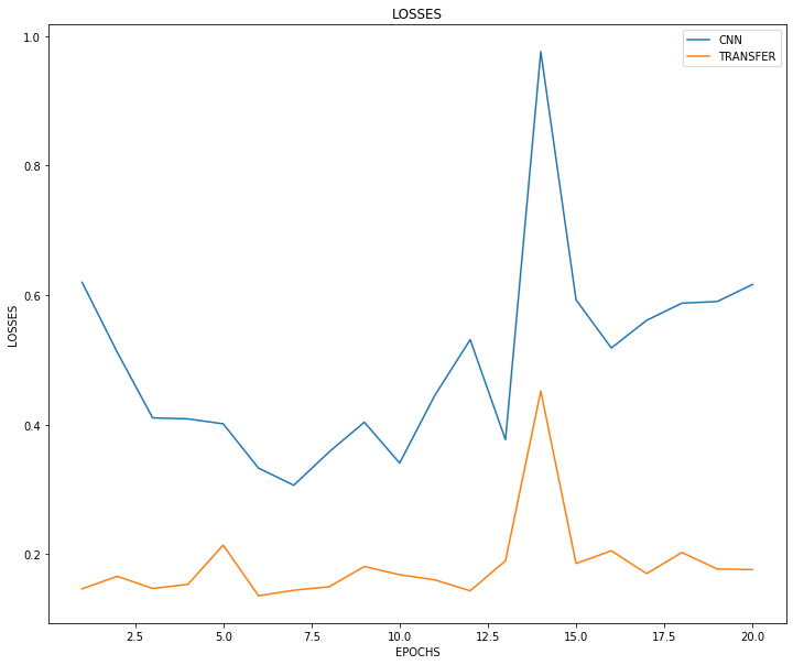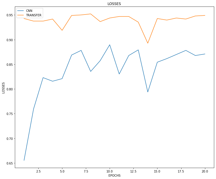 Losses 와 Accuracy를 보면, Transfer Learning 모델이 훨씬 초기 수렴이 빠를 뿐더러, 최종 성능도 accuracy 기준 약 10% 가량 우수하다는 것을 확인할 수 있습니다.