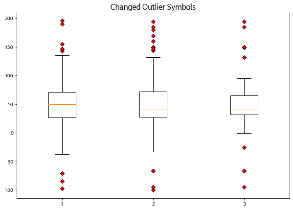outlier_marker = dict(markerfacecolor='r', marker='D')plt.title('Changed Outlier Symbols', fontsize=15)