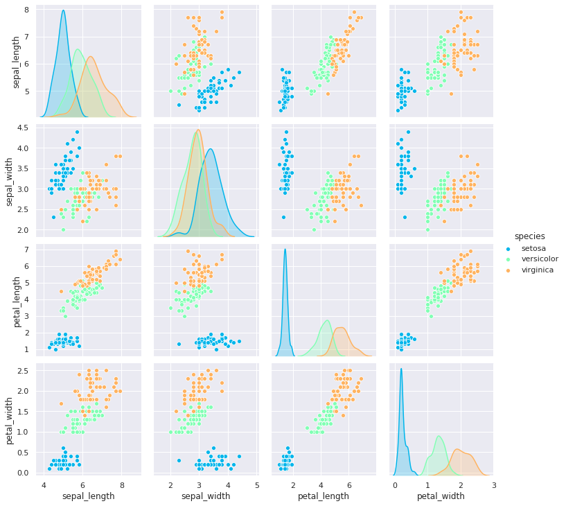 sns.pairplot(iris, hue='species', palette="rainbow")