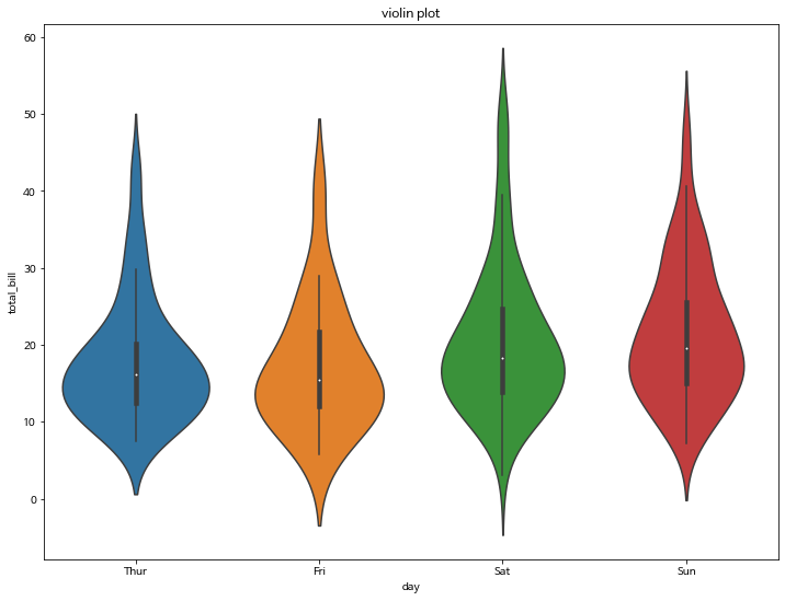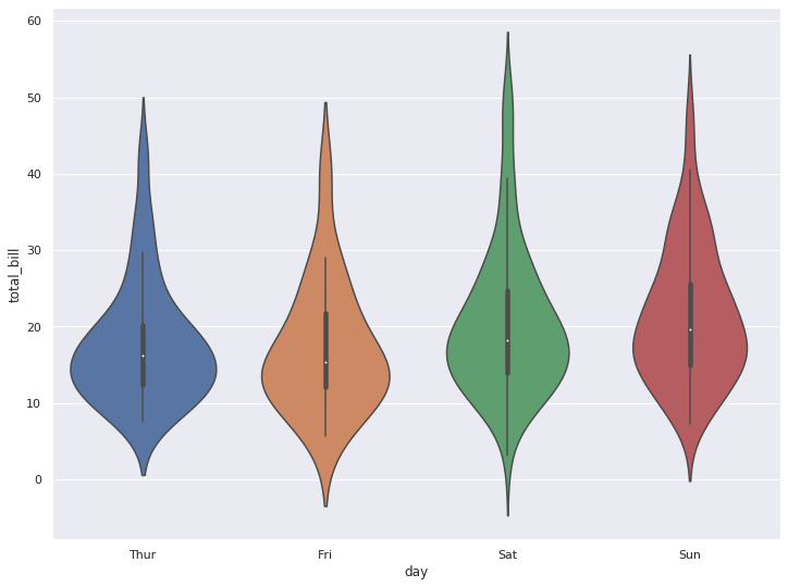 tips = sns.load_dataset("tips")sns.violinplot(x="day", y="total_bill", data=tips)