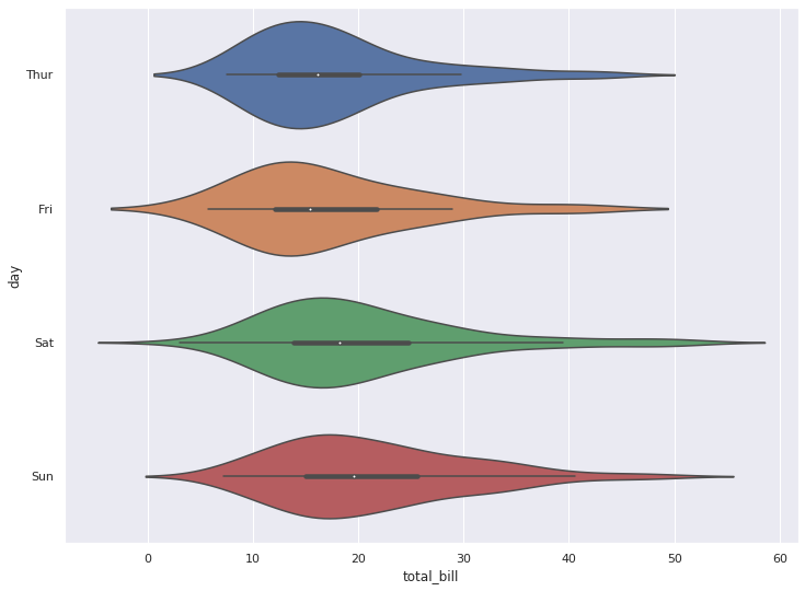 sns.violinplot(y="day", x="total_bill", data=tips)