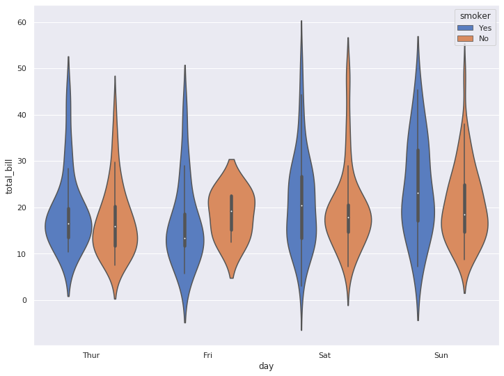 sns.violinplot(x="day", y="total_bill", hue="smoker", data=tips, palette="muted")