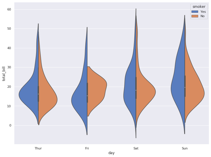 sns.violinplot(x="day", y="total_bill", hue="smoker", data=tips, palette="muted", split=True)