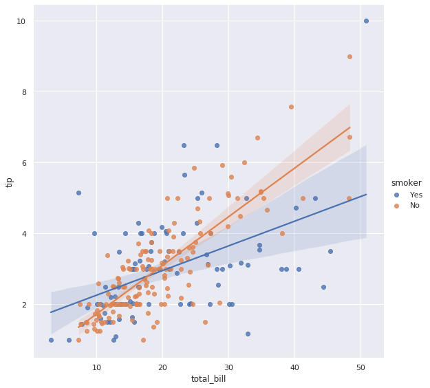 sns.lmplot(x="total_bill", y="tip", hue="smoker", height=8, data=tips)