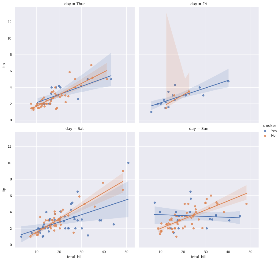sns.lmplot(x='total_bill', y='tip', hue='smoker', col='day', col_wrap=2, height=6, data=tips)