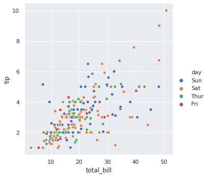 sns.relplot(x="total_bill", y="tip", hue="day", data=tips)