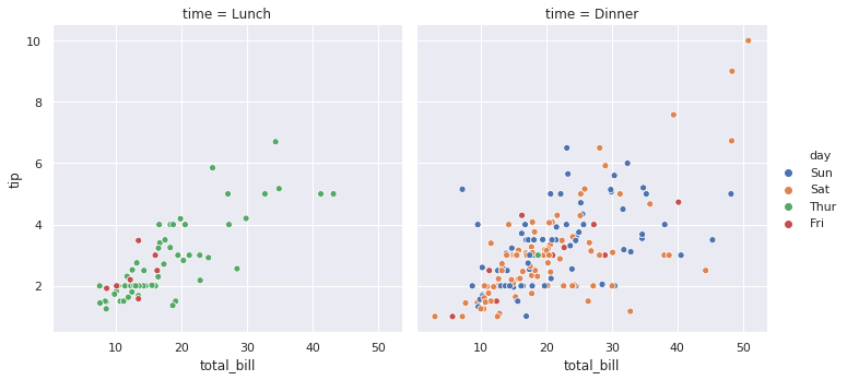 sns.relplot(x="total_bill", y="tip", hue="day", col="time", data=tips)