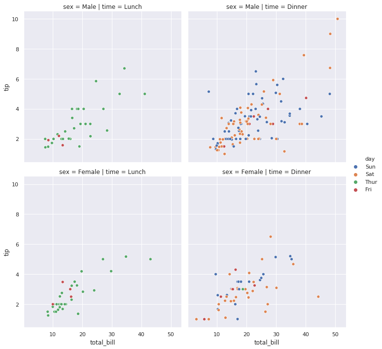 sns.relplot(x="total_bill", y="tip", hue="day", row="sex", col="time", data=tips)