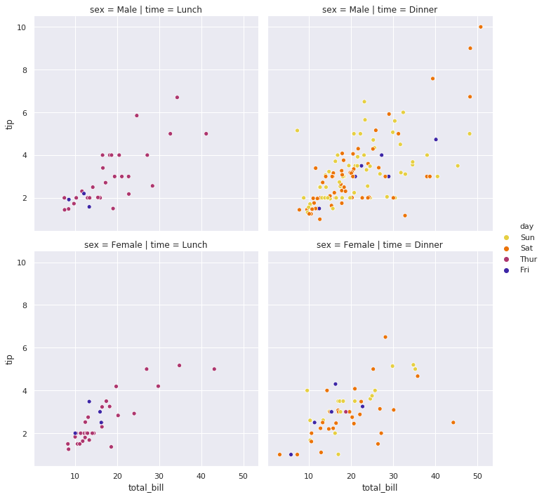 sns.relplot(x="total_bill", y="tip", hue="day", row="sex", col="time", palette='CMRmap_r', data=tips)