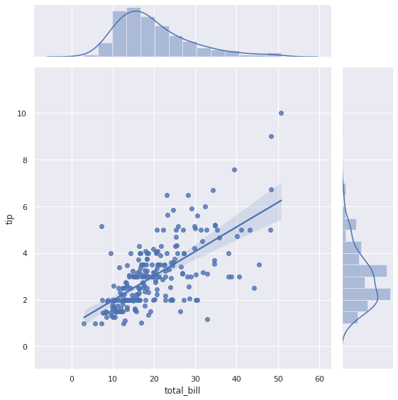 sns.jointplot("total_bill", "tip", height=8, data=tips, kind="reg")