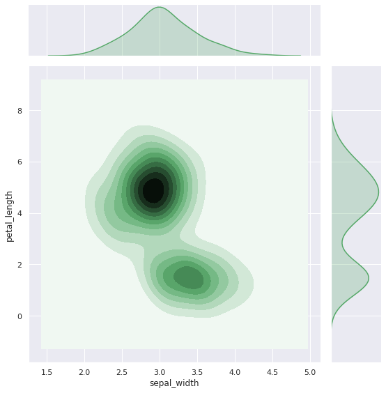 sns.jointplot("sepal_width", "petal_length", height=8, data=iris, kind="kde", color="g")