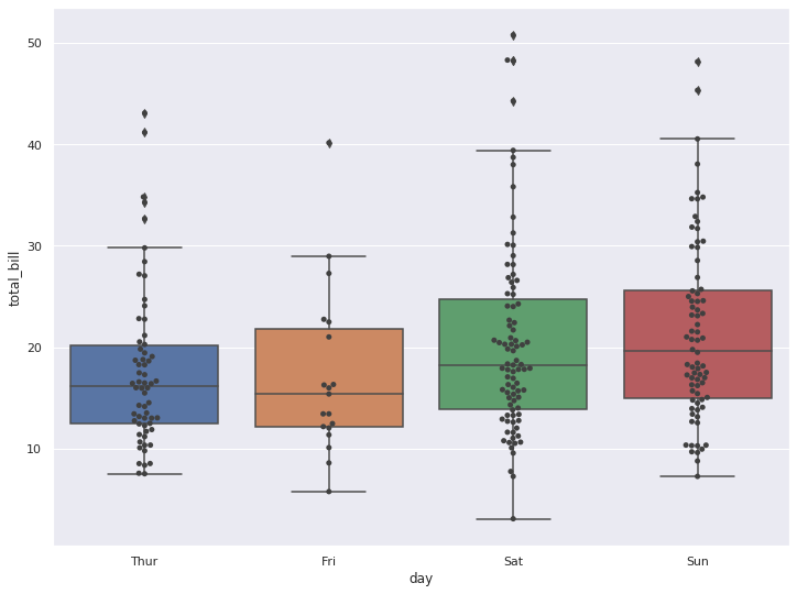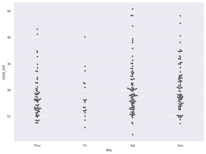 sns.swarmplot(x='day', y='total_bill', data=tips, color='.25')