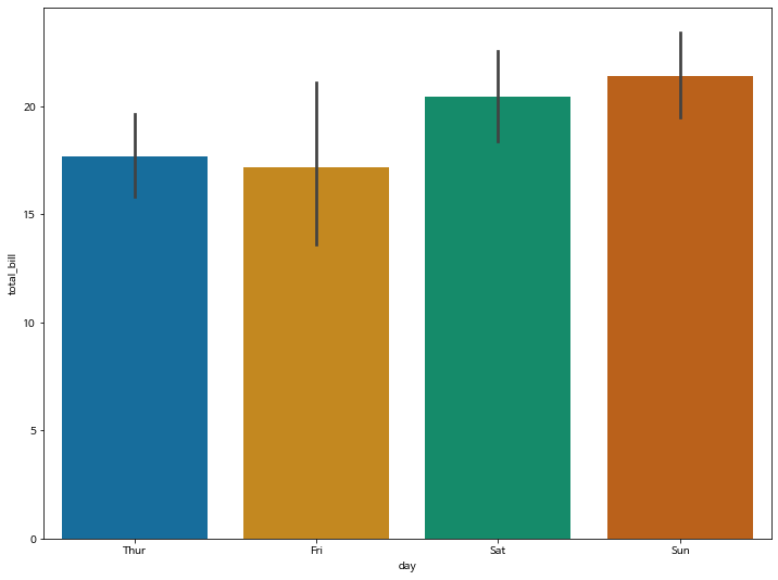 sns.barplot(x="day", y="total_bill", data=tips, palette='colorblind')