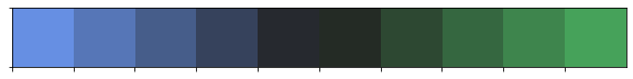 sns.palplot(sns.diverging_palette(255, 133, l=60, n=10, center="dark"))