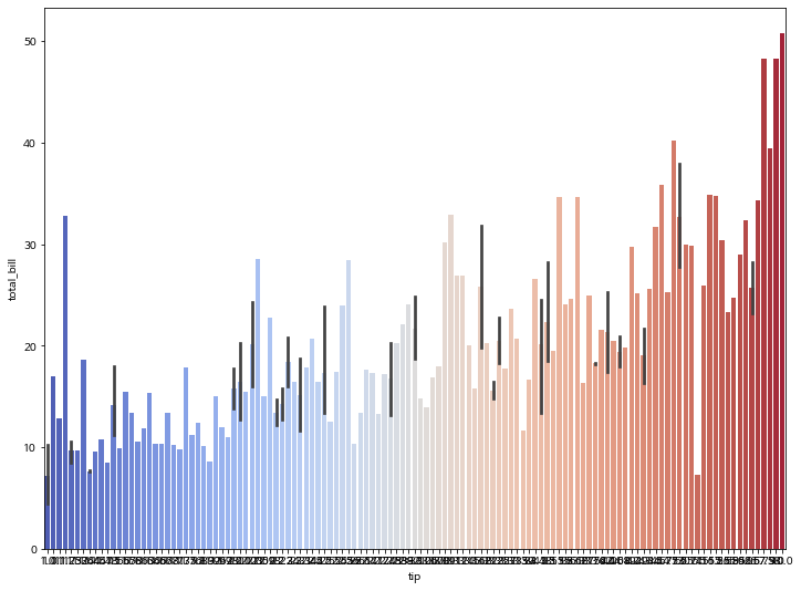 sns.barplot(x="tip", y="total_bill", data=tips, palette='coolwarm')