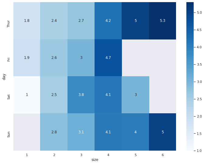 sns.heatmap(pivot, cmap='Blues', annot=True)