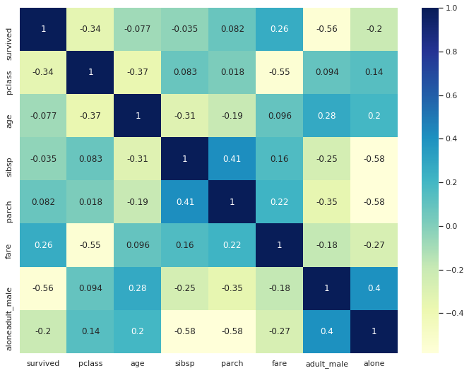 sns.heatmap(titanic.corr(), annot=True, cmap="YlGnBu")