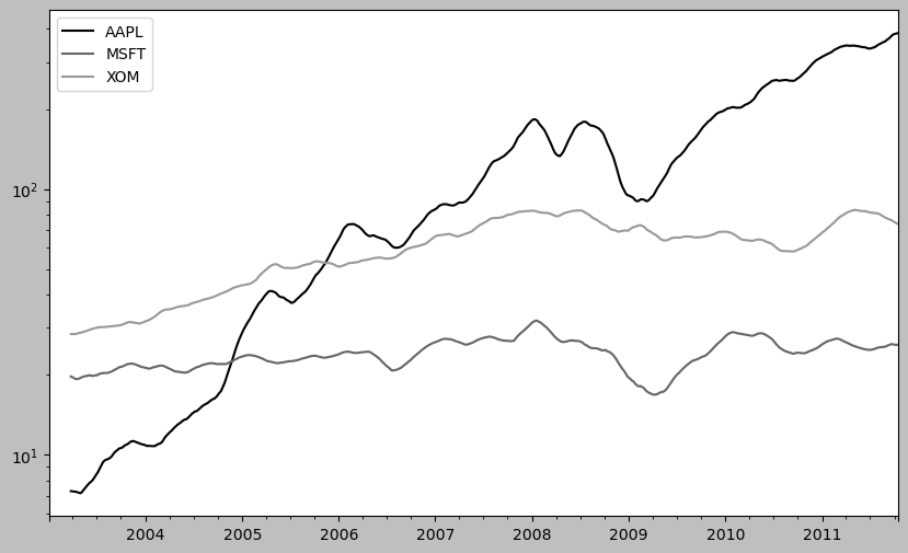 close_px.rolling(60).mean().plot(logy=True)