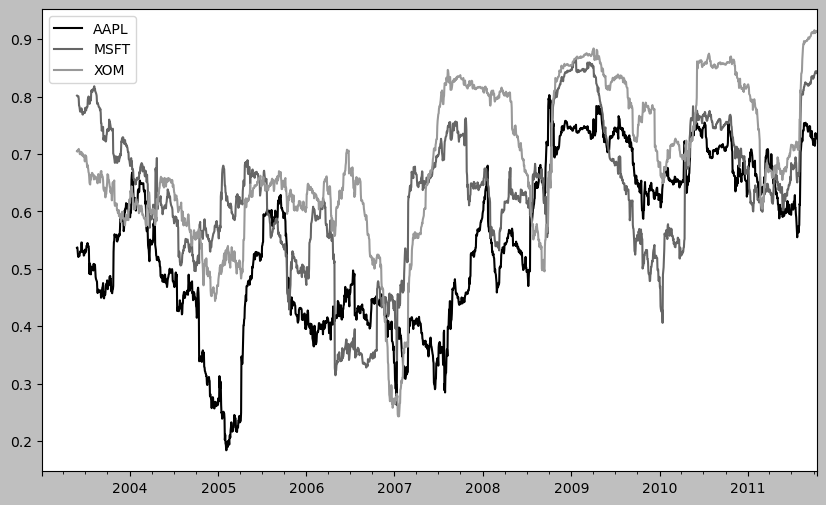 returns = close_px.pct_change()corr = returns["AAPL"].rolling(125, min_periods=100).corr(spx_rets)
