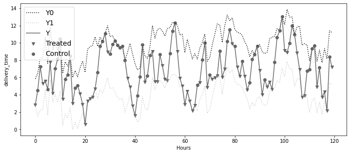 return np.mean((y1_rec - y0_rec)[m:])ipw_switchback(df["d"], df["delivery_time"], np.ones(len(df)) == 1, m=2, p=0.5)-7.426440677966101
