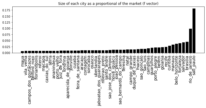 plt.title("Size of each city as a proportional of the market (f vector)")