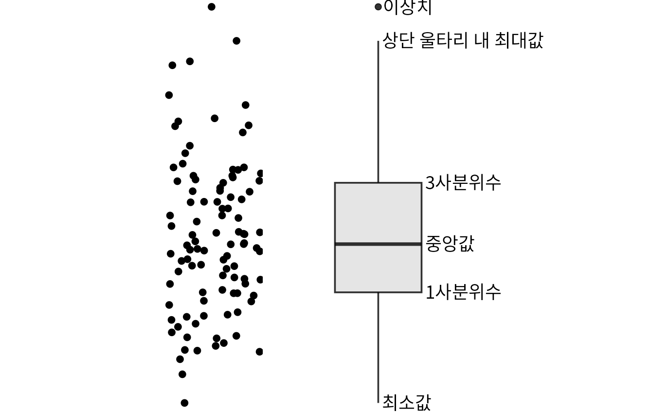 (ref:boxplot-schematic) 상자 그림의 구조. 왼쪽의 점 구름(dot cloud) 데이터를 오른쪽과 같은 상자 그림으로 변환합니다. 상자 중앙의 굵은 선은 중앙값을 뜻하며, 상자의 위아래 끝은 각각 3사분위수와 1사분위수를 나타내어 전체 데이터의 중간 50%가 이 상자 안에 위치함을 보여줍니다. 상자 밖으로 뻗어 나간 선(수염, whiskers)은 데이터의 범위를 나타내는데, 보통 상자 높이의 1.5배 이내에 있는 최댓값과 최솟값까지 뻗습니다. 이 범위를 벗어나는 데이터는 ’이상치(outliers)’로 간주하여 점으로 따로 표시합니다.