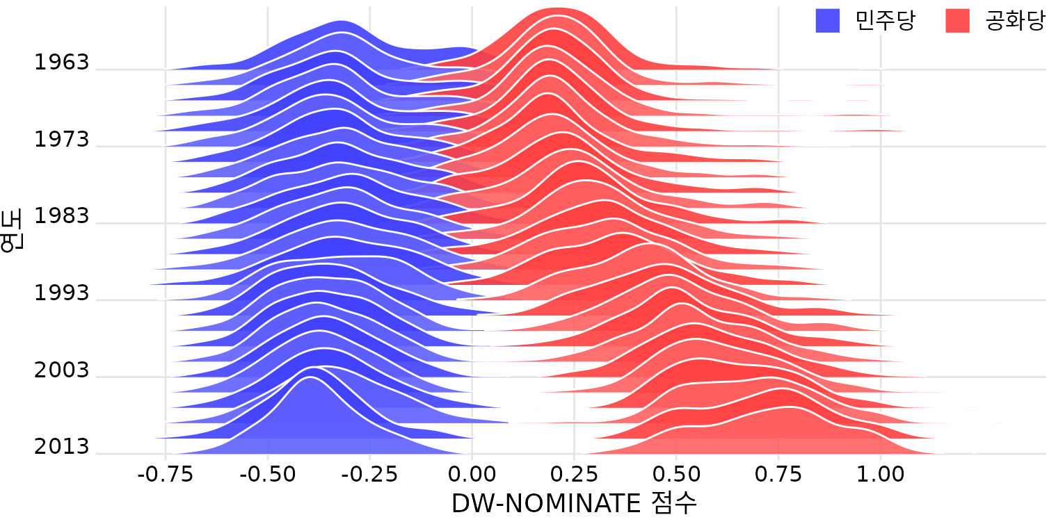 또한 능선 그림은 두 집단의 성향 차이를 시간순으로 분석할 때도 매우 유용합니다. 그림 ?fig-dw-nominate-ridgeline은 미국 하원 의원들의 투표 패턴(보수/진보 성향)을 수십 년간 추적한 것입니다. 민주당과 공화당의 분포를 서로 다른 색으로 칠해 엇갈려 배치함으로써, 시간이 흐를수록 두 당의 정치적 양극화가 얼마나 심해졌는지를 한 폭의 그림으로 완벽하게 보여줍니다.