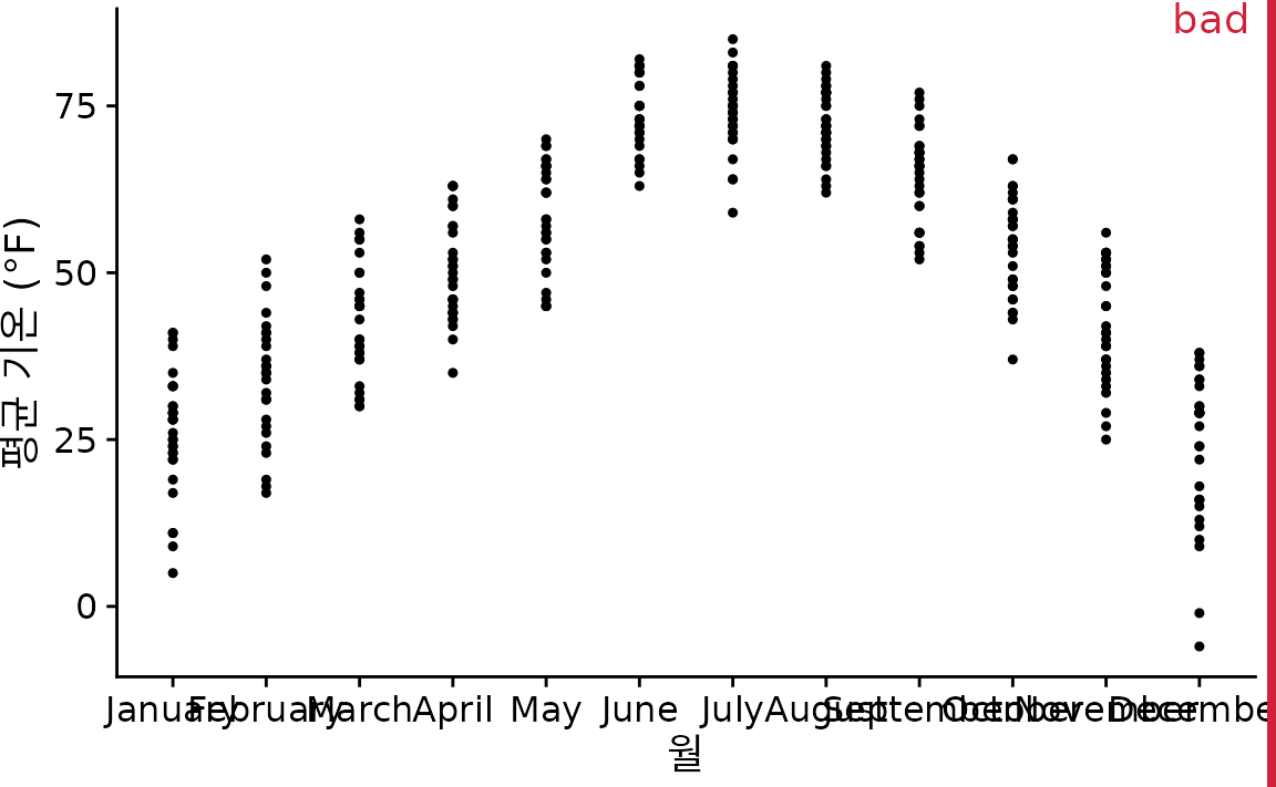 (ref:lincoln-temp-all-points) 네브래스카주 링컨의 일일 평균 기온을 스트립 차트로 표현했습니다. 각 점은 하루의 기온을 나타냅니다. 점들이 무수히 겹쳐 있어 실제 밀도를 파악하기 어렵기 때문에 “나쁨”으로 분류되었습니다.