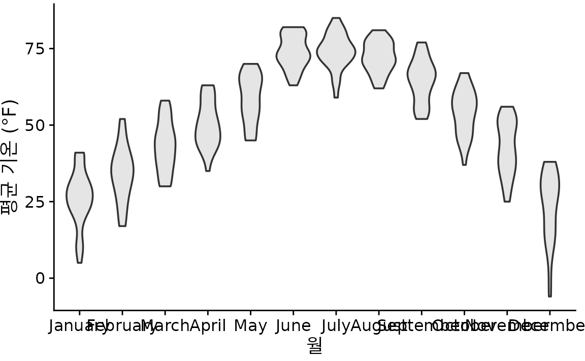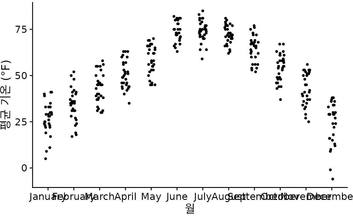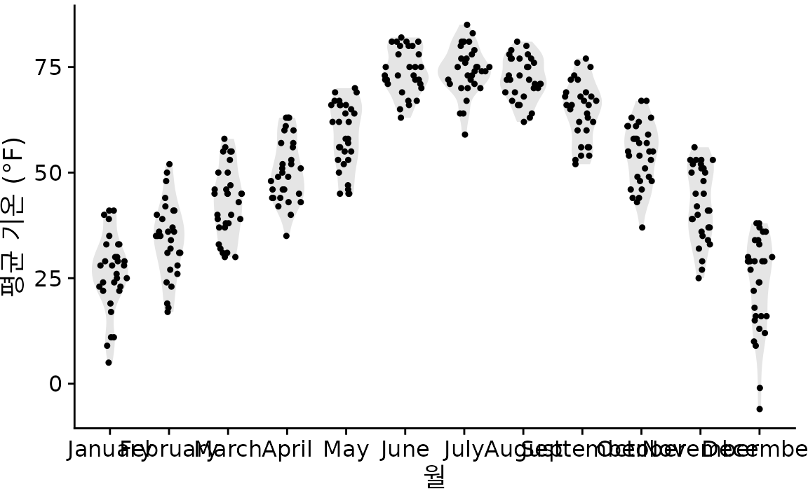 많은 수의 분포를 다룰 때는 항상 ’반응 변수(response variable)’와 ’그룹화 변수(grouping variable)’라는 개념으로 접근하는 것이 좋습니다. 반응 변수는 우리가 그 분포를 알고 싶어 하는 대상(예: 온도)이고, 그룹화 변수는 데이터를 구분하는 기준(예: 월)입니다. 이 장에서 소개할 기법들은 모두 한 축에는 반응 변수를, 다른 축에는 그룹화 변수를 할당합니다. 먼저 세로축에 반응 변수를 두는 방식부터 시작해서, 가로축에 두는 방식까지 차례로 살펴보겠습니다.