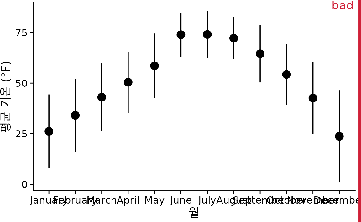 여러 분포를 한눈에 보여주는 가장 단순한 방법은 평균이나 중앙값을 점으로 찍고, 그 주변의 변동 폭을 ’오차 막대(error bar)’로 표시하는 것입니다. 그림 ?fig-lincoln-temp-points-errorbars는 2016년 네브래스카주 링컨의 월별 기온 분포를 이 방식으로 그린 것입니다. 하지만 저는 이 그래프에 “나쁨” 표시를 해두었습니다. 몇 가지 치명적인 문제점이 있기 때문입니다.
