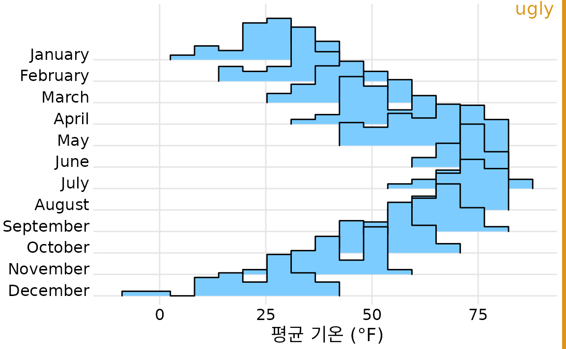 능선 그림에 밀도 곡선 대신 히스토그램을 쓰는 것도 불가능하진 않지만, 추천하지 않습니다. 그림 ?fig-temp-binline을 보면 알 수 있듯, 여러 히스토그램이 어설프게 겹치면서 시각적으로 매우 혼란스럽고 지저분해 보이기 때문입니다.