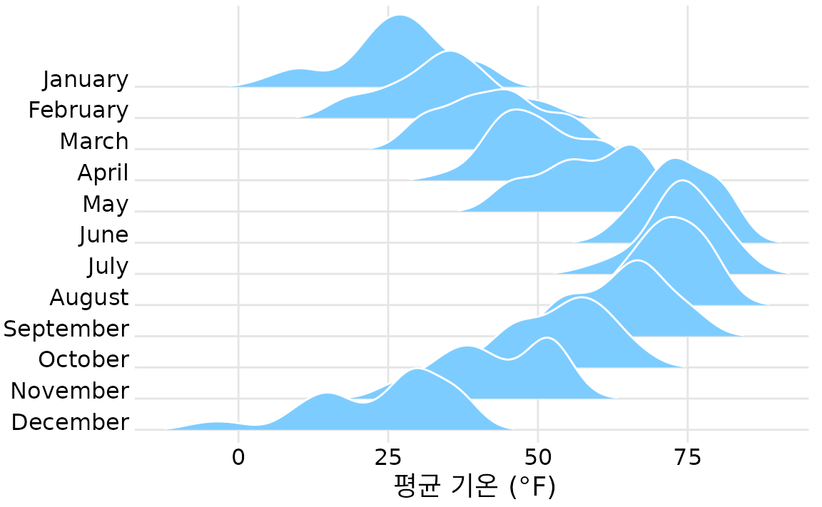 가장 표준적인 능선 그림은 밀도 추정 방식을 사용합니다(그림 Figure 11.9). 바이올린 그림과 원리는 비슷하지만, 여러 그룹을 수직으로 나열하기 때문에 분포의 차이가 훨씬 더 직관적으로 다가옵니다. 예를 들어 11월의 이봉성 분포는 바이올린 그림(Figure 11.5)보다 능선 그림(Figure 11.9)에서 훨씬 뚜렷하게 보입니다.