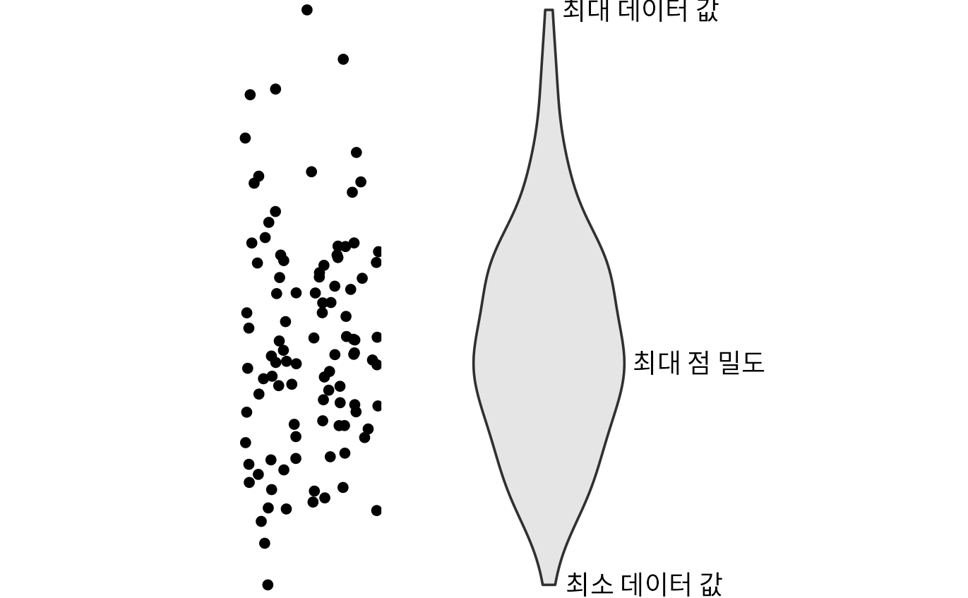 상자 그림은 1970년대 통계학자 존 튜키(John Tukey)가 고안했습니다. 당시엔 그래프를 손으로 직접 그려야 했기 때문에, 간단한 규칙만으로 많은 정보를 담을 수 있는 상자 그림이 큰 인기를 끌었습니다. 하지만 현대의 강력한 컴퓨팅 환경에선 더 정교한 시각화가 가능해졌고, 그 결과 최근에는 상자 그림을 대신해 바이올린 그림(violin plot)이 자주 쓰입니다. 바이올린 그림은 밀도 추정치를 90도 회전한 뒤 대칭으로 이어 붙여 만든 모양입니다(그림 Figure 11.4). 상자 그림의 역할을 그대로 수행하면서도 데이터의 미묘한 흐름을 훨씬 잘 보여줍니다. 특히 상자 그림이 놓치기 쉬운 ‘이봉형(bimodal, 봉우리가 두 개인)’ 데이터의 특성도 바이올린 그림에서는 명확히 드러납니다.