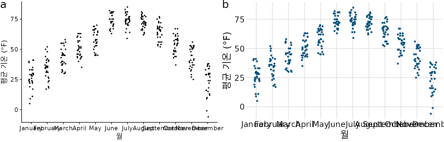 이 책 전체에서 다른 그림을 재현하지만 반복하지는 않는 그림의 많은 예를 보았습니다. 예를 들어, 챕터 ?sec-avoid-line-drawings는 각 세트의 모든 그림이 동일한 데이터를 보여주지만 각 세트의 각 그림이 다소 다르게 보이는 여러 그림 세트를 보여줍니다. 마찬가지로, 그림 Figure 30.1 (a)는 각 데이터 포인트에 적용된 임의 지터까지 그림 ?fig-lincoln-temp-jittered를 반복한 반면, 그림 Figure 30.1 (b)는 해당 그림의 재현일 뿐입니다. 그림 Figure 30.1 (b)는 그림 ?fig-lincoln-temp-jittered와 다른 지터를 가지고 있으며, 두 그림이 데이터에 대한 동일한 정보를 명확하게 전달하더라도 두 그림이 상당히 다르게 보이도록 충분히 다른 시각적 디자인을 사용합니다.