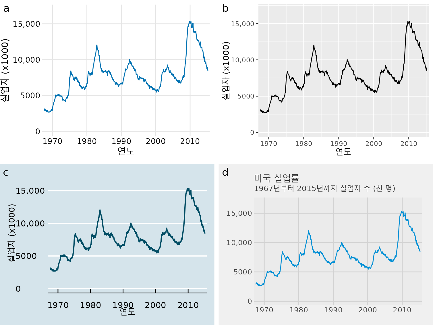 (ref:unemploy-themes) 1970년부터 2015년까지 미국의 실업자 수. 동일한 그림이 네 가지 다른 ggplot2 테마를 사용하여 표시됩니다. (a) 이 책의 기본 테마; (b) 이 책의 모든 그림을 만드는 데 사용한 플로팅 소프트웨어인 ggplot2의 기본 테마; (c) 이코노미스트에 표시된 시각화를 모방한 테마; (d) 파이브서티에이트에 표시된 시각화를 모방한 테마. 파이브서티에이트는 종종 플롯 제목과 부제목을 위해 축 레이블을 생략하므로 그에 따라 그림을 조정했습니다. 데이터 출처: 미국 노동 통계국