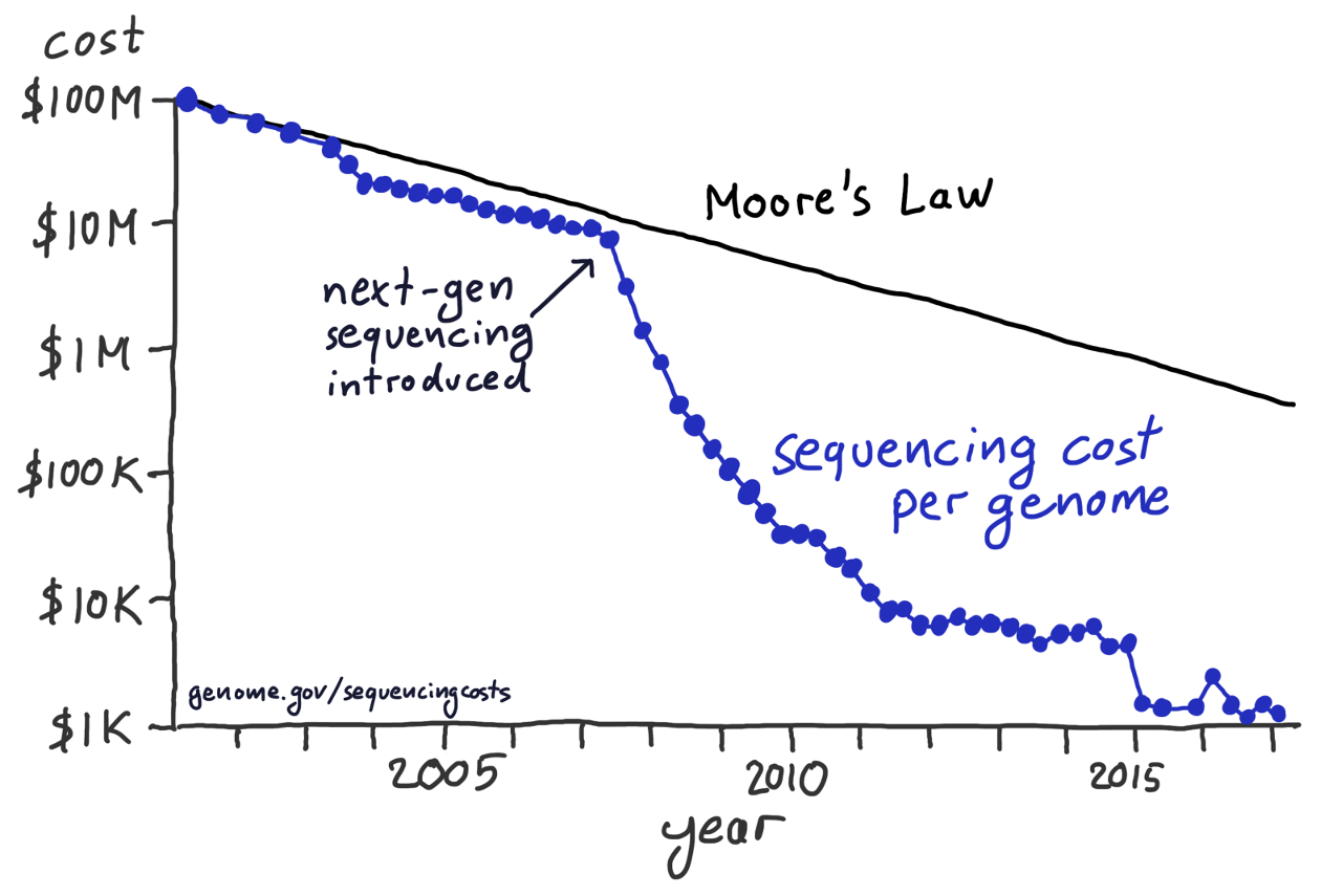 (ref:sequencing-cost) 차세대 시퀀싱 방법이 도입된 후 게놈당 시퀀싱 비용은 무어의 법칙에서 예측한 것보다 훨씬 빠르게 감소했습니다. 이 손으로 그린 그림은 국립 보건원에서 준비한 널리 알려진 시각화를 재현한 것입니다. 데이터 출처: 국립 인간 게놈 연구소