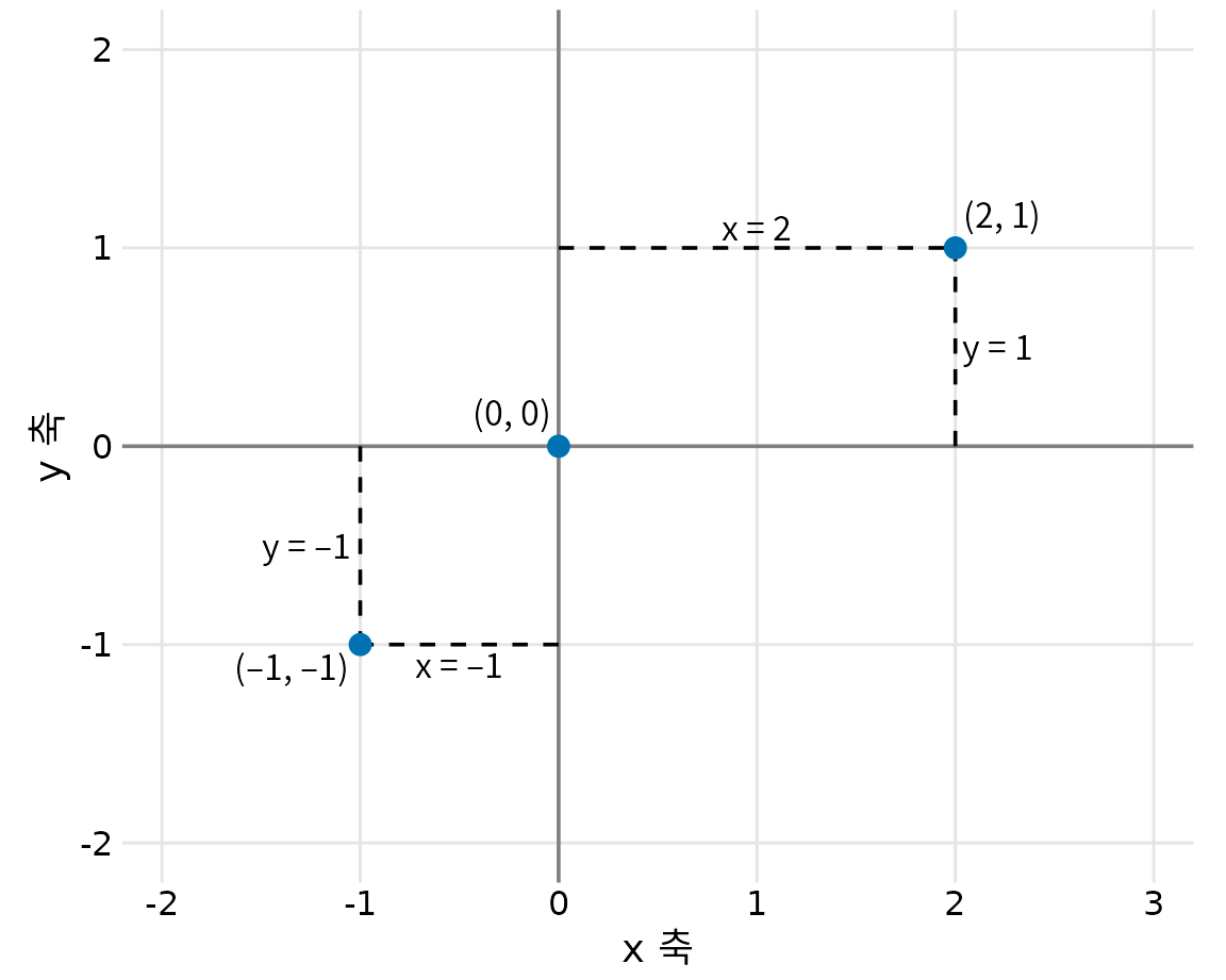 데이터 시각화에서 가장 널리 쓰이는 좌표계는 2차원 데카르트 좌표계(Cartesian coordinate system)입니다. 각 위치는 x와 y 값에 의해 고유하게 결정됩니다. x축과 y축은 서로 직각을 이루며, 데이터 값은 두 축을 따라 균일한 간격으로 배치됩니다(그림 Figure 5.1). 이 두 축은 물리적으로 연속적인 위치 척도이며 양수와 음수 실수를 모두 표현할 수 있습니다. 좌표계를 온전히 정의하려면 각 축이 담아낼 숫자 범위를 지정해야 합니다. 그림 ?fig-cartesian-coord에서 x축은 -2.2에서 3.2까지, y축은 -2.2에서 2.2까지의 범위를 갖습니다. 이 범위 안에 있는 데이터 값들은 그래프상의 해당 위치에 표시되며, 범위를 벗어나는 데이터는 제외됩니다.