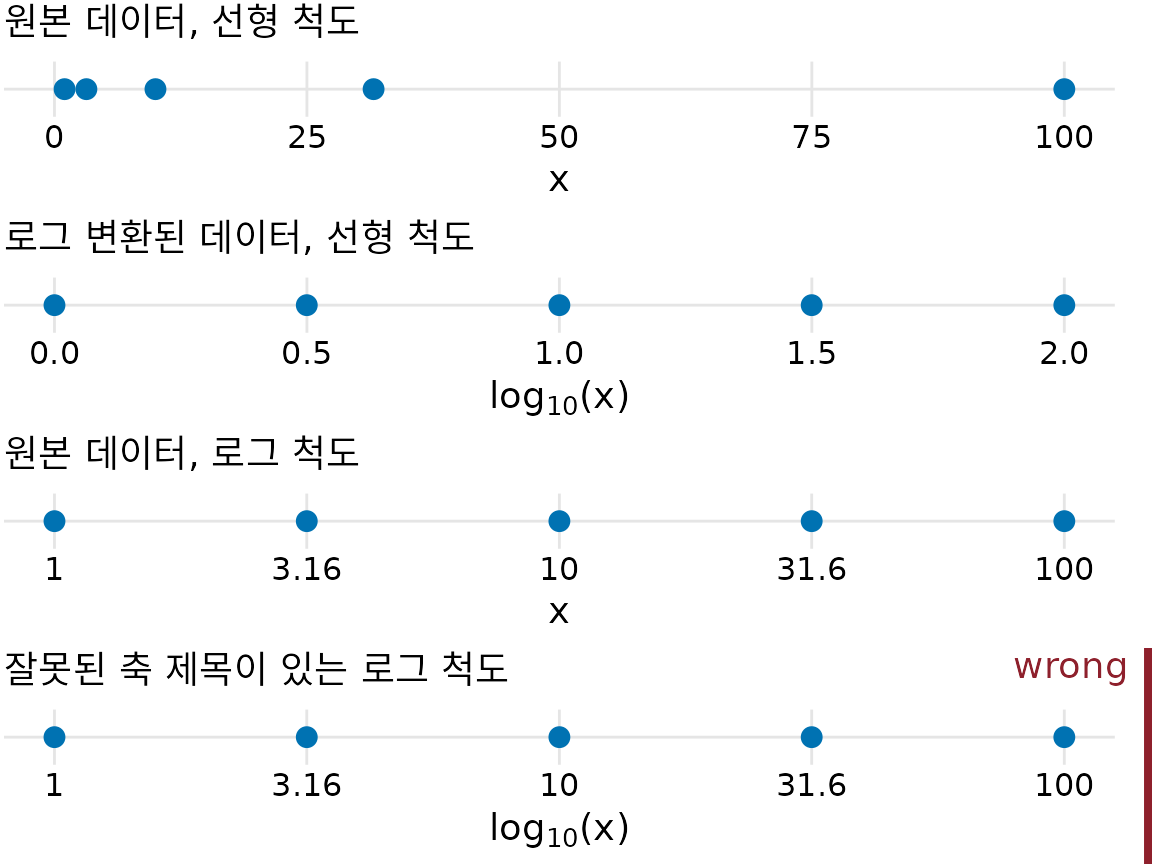 수학적으로만 보면 로그 변환된 데이터를 선형 척도에 그리는 것과, 원래 데이터를 로그 척도에 그리는 것 사이에는 차이가 없습니다(그림 Figure 5.4). 하지만 실제로는 로그 척도를 사용하는 것이 훨씬 바람직합니다. 축의 눈금 레이블이 원래의 숫자 형태를 유지하므로 독자가 데이터를 해석하는 데 힘을 덜 써도 되기 때문입니다. 또한 로그의 밑(base)에 대한 혼동도 줄일 수 있습니다. 로그 변환된 데이터는 자연로그(ln)를 썼는지 밑이 10인 상용로그를 썼는지 헷갈리기 쉽고, ’log(x)’처럼 밑을 표시하지 않은 모호한 레이블도 흔합니다. 따라서 로그 척도를 쓸 때는 항상 어떤 밑을 썼는지 확인하고, 축 레이블에 명확히 명시하는 것이 중요합니다.