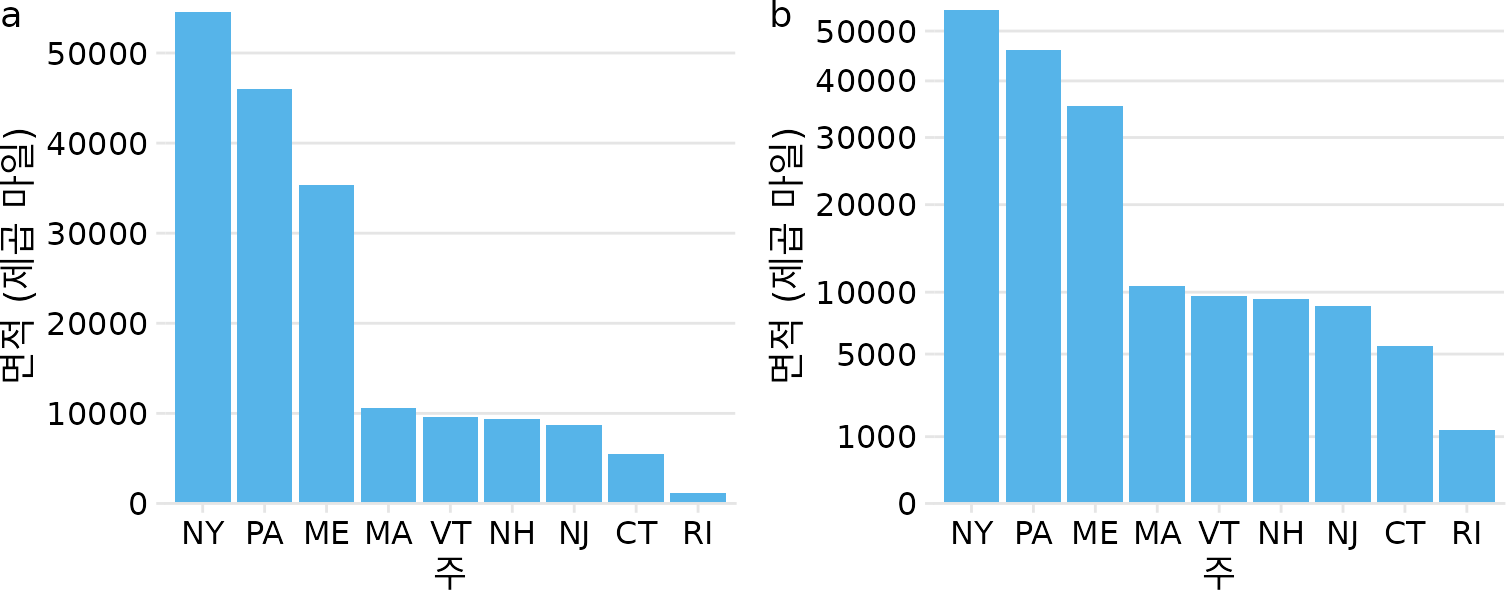 이러한 단점에도 불구하고 제곱근 척도는 나름의 쓰임새가 있습니다. 로그 척도가 ’비율’에 적합하듯, 제곱근 척도는 ’제곱’의 성질을 가진 데이터에 자연스럽게 어울립니다. 대표적인 사례가 바로 ’지리적 면적’입니다. 주(state)나 국가의 면적에 제곱근을 취해 그리면, 그 지역을 가로지르는 선형적 거리(동서나 남북 길이)를 강조하게 됩니다. 이는 예를 들어 그 지역을 자동차로 가로지르는 데 걸리는 시간과 관련이 있을 것입니다. 그림 ?fig-northeast-state-areas는 미국 북동부 주들의 면적을 선형 척도와 제곱근 척도로 보여줍니다. 주들의 실제 면적 차이는 매우 크지만(그림 a), 각 주를 운전해서 지나가는 체감 거리는 제곱근 척도(그림 b)에서 더 균형 있게 느껴질 것입니다.