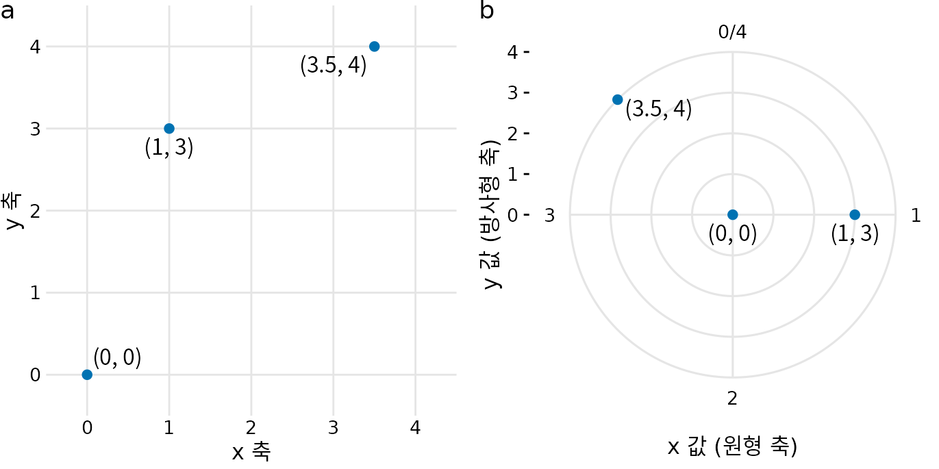 (ref:polar-coord) 데카르트 좌표와 극좌표의 관계. (a) 데카르트 좌표계의 세 점. (b) 같은 점들을 극좌표계에 나타낸 모습. (a)의 x좌표는 각도로, y좌표는 반지름으로 쓰였습니다. 이 예에서 원형 축은 0에서 4까지의 범위를 가지며, 0과 4는 같은 위치가 됩니다.
