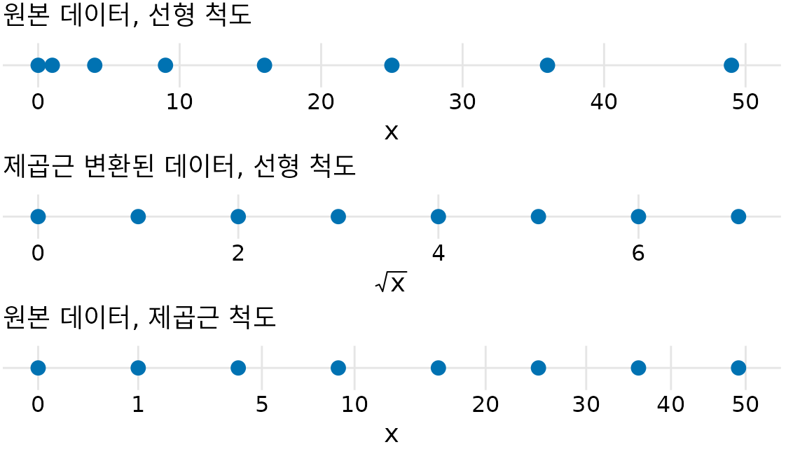 제곱근 척도에는 두 가지 난제가 있습니다. 첫째, 선형 척도에서의 한 칸 이동은 ’일정한 값을 더함’을 뜻하고 로그 척도에서는 ’일정한 비율을 곱함’을 뜻하는 반면, 제곱근 척도에서는 그러한 명확한 규칙이 없습니다. 다시 말해 한 칸의 의미가 현재 위치에 따라 달라집니다. 둘째, 축 눈금을 어디에 두어야 할지 모호합니다. 눈금을 일정한 모양으로 배치하려면 제곱수 위치에 두어야 하는데, 0, 4, 25, 49, 81 같은 숫자는 직관적이지 않죠. 그렇다고 선형 간격(10, 20, 30…)으로 눈금을 두면 척도의 낮은 쪽은 눈금이 너무 적고 높은 쪽은 너무 많아집니다. 그림 ?fig-sqrt-scales에서는 0, 1, 5, 10, 20, 30, 40, 50 위치에 눈금을 두었는데, 이는 데이터 범위를 적절히 보여주기 위한 임의의 선택입니다.
