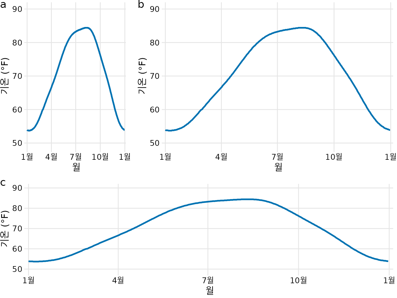 (ref:temperature-normals-Houston) 텍사스주 휴스턴의 일일 기온 정상값. 기온은 y축, 날짜는 x축에 매핑되었습니다. (a), (b), (c)는 같은 데이터를 서로 다른 종횡비로 시각화한 예시입니다. 세 형태 모두 온도 데이터를 시각화하는 올바른 방법입니다. 데이터 출처: NOAA.