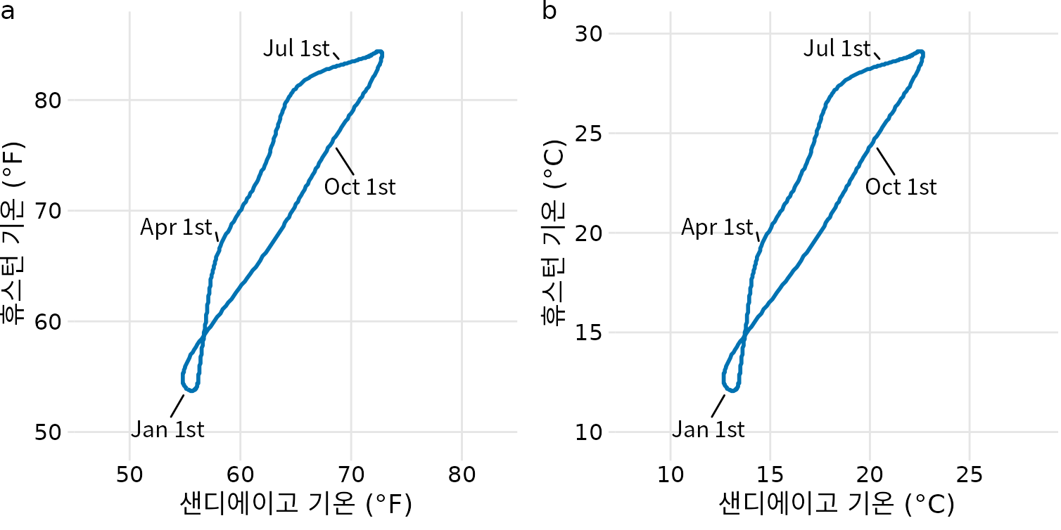 데이터의 단위를 바꾸면 어떻게 될지 궁금할 수 있습니다. 사실 단위란 것은 어느 정도 인위적인 것이고, 사람마다 선호하는 단위가 다를 수 있죠. 단위를 바꾸는 일은 대개 선형 변환(모든 데이터에 상수를 더하거나 빼기, 혹은 곱하기)에 해당합니다. 다행히 데카르트 좌표계는 이러한 선형 변환에 대해 불변하는 성질이 있습니다. 즉, 데이터의 단위를 바꾸고 그에 맞춰 축을 조정하면 결과물인 그림 자체는 변하지 않습니다. 그림 ?fig-temperature-normals-Houston-San-Diego의 (a)부분과 (b)부분을 비교해보세요. 둘 다 같은 데이터를 보여주지만 (a)는 화씨를, (b)는 섭씨를 사용했습니다. 격자선의 위치와 축의 숫자는 다르지만, 데이터가 그려진 모습은 완벽하게 일치합니다.