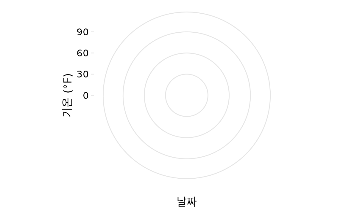 극좌표는 주기성을 가진 데이터를 표현할 때 유용합니다. 척도의 시작과 끝이 논리적으로 연결되기 때문입니다. 일 년의 ’날짜’를 예로 들어보죠. 12월 31일은 한 해의 마지막 날인 동시에, 첫날인 1월 1일의 바로 전날이기도 합니다. 일 년 동안 특정 수치가 어떻게 변하는지 보여주려 할 때, 날짜를 각도로 변환해 극좌표에 그리면 이러한 주기적 성질을 잘 살릴 수 있습니다. 이 개념을 앞서 본 기온 데이터에 적용해보겠습니다. 기온 정상값은 장기 평균치이므로, 12월 31일과 1월 1일은 시각적으로 맞닿아 있는 것이 자연스럽습니다. 기온 데이터를 극좌표에 그리면 바로 이러한 연결성이 강조됩니다(그림 Figure 5.10). 특히 늦가을부터 초봄까지 데스밸리, 휴스턴, 샌디에이고의 기온이 얼마나 비슷하게 움직이는지 한눈에 보입니다. 데카르트 좌표계에서는 12월 말과 1월 초의 데이터가 그림의 양 끝으로 갈라져 있어 이러한 유사성을 파악하기 어려웠던 것과 대조적입니다.