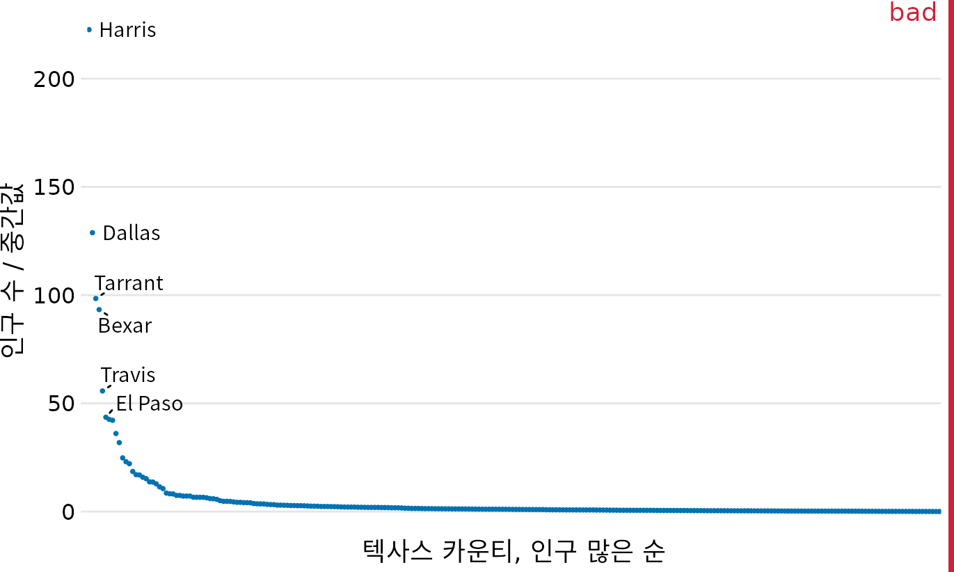 로그 척도는 데이터의 수치 범위가 매우 넓을 때 자주 쓰입니다. 앞에 나온 텍사스 카운티만 봐도 가장 인구가 많은 해리스(Harris) 카운티는 약 400만 명이지만, 가장 적은 러빙(Loving) 카운티는 고작 82명뿐입니다. 비율로 바꾸지 않았더라도 로그 척도는 적절한 선택이었을 것입니다. 그렇다면 만약 인구가 0명인 카운티가 있다면 어떨까요? 그곳은 로그 척도의 음의 무한대에 위치하므로 그래프에 그릴 수 없습니다. 이럴 때는 로그 대신 제곱근 척도(square root scale)를 쓰기도 합니다(그림 Figure 5.7). 로그처럼 큰 숫자를 압축해주면서도, 0 값을 허용한다는 장점이 있습니다.