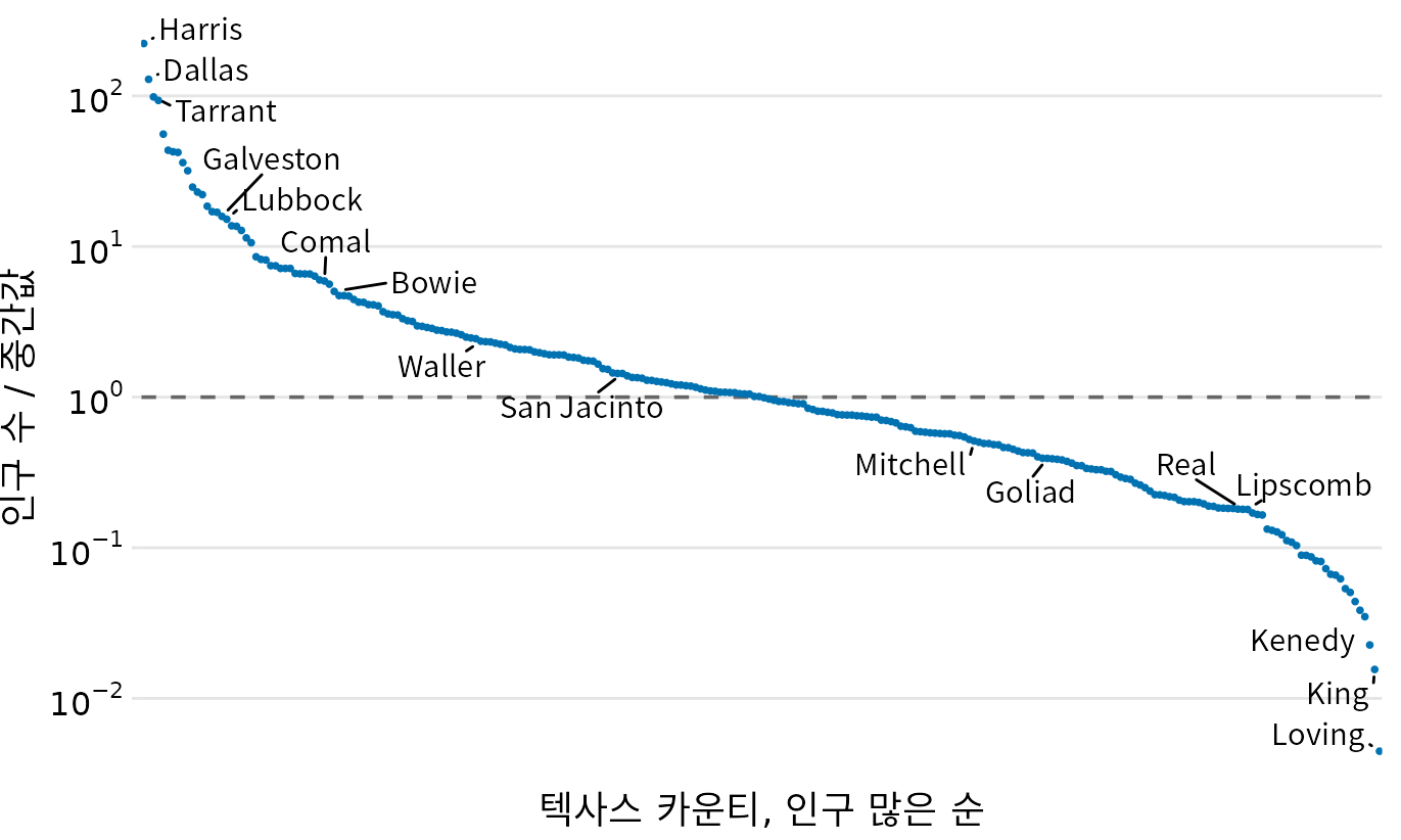 (ref:texas-counties-pop-ratio-log) 텍사스주 카운티 인구와 중앙값의 비율. 몇몇 카운티 이름을 강조했습니다. 점선은 비율 1(중앙값)을 나타냅니다. 인구가 가장 많은 곳은 중앙값보다 약 100배 더 많고, 가장 적은 곳은 약 100배 더 적습니다. 데이터 출처: 2010년 미국 인구조사.